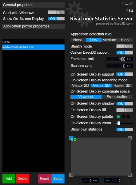 You should be met with this screen. If you want only a specific game to be affected by RTSS, click on the green “Add” button, navigate to wherever “marbleblast-patched.exe” is (unlocked fps version) and select that. Copy all of the settings from the right hand side of the screenshot onto your copy of RTSS, you can adjust a few of these settings to your liking.