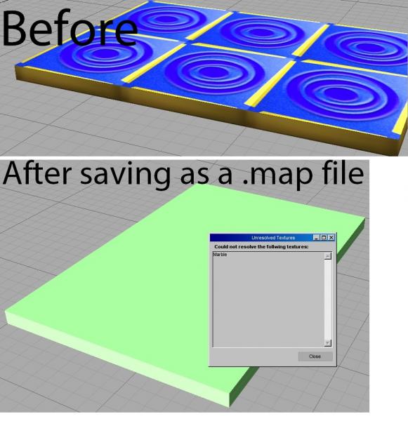 I have not been able to export the test interior I made, because upon saving it as a map file it replaces all the materials to use with a green "Marble" texture that it can not find.