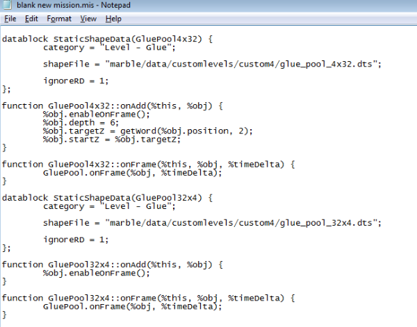 2. I am midway through a quantum glue custom level, again I copied and pasted the coding from the island of kollas level to make the quantum glue work. I know this will limit me to using DTS files that are only in the current levels due to the DTS shape exporter not working. I managed to make the "2x2 tile" glue ponds work perfectly (attachment G4), but the larger glue ponds only show the texture of glue, but the quantum does not activate. (See attachments G1, & G3)