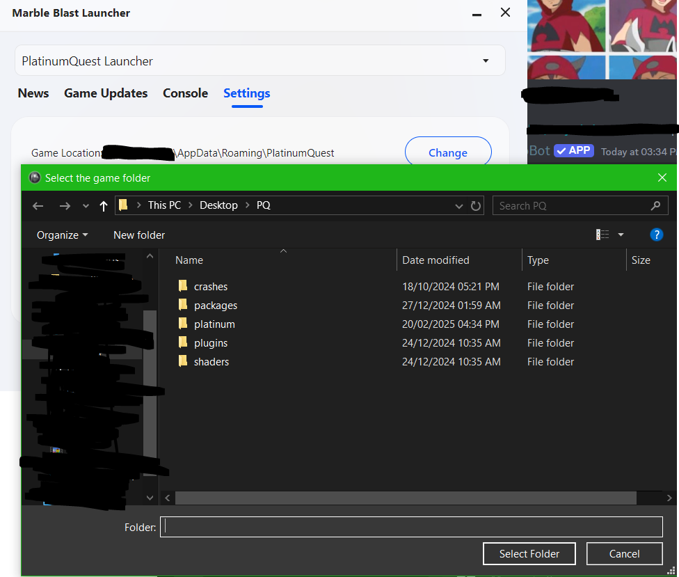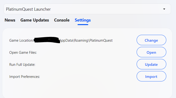 The directory text under settings doesn't update to the new directory I assigned PlatinumQuest under. The file is properly referenced and updated accordingly, this is just a visual bug.