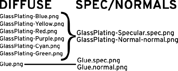 ...Where GlassPlating-Blue is the diffuse map. None of the textures had spec/normals in-game, including the one I didn't need a function for. The Ultra levels were working fine.
