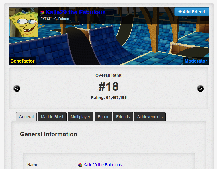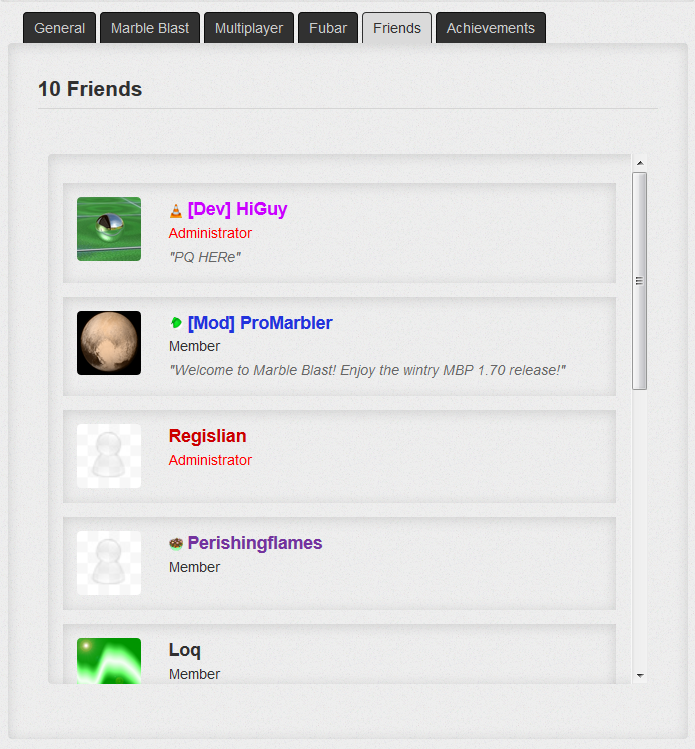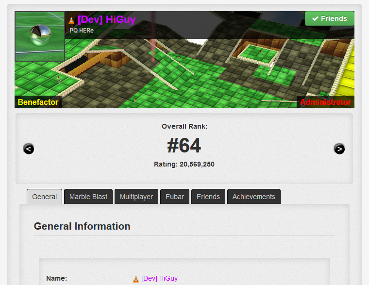You can also easily view other user profiles and quickly determine whether or not you've flagged them as your Friend, directly from the website! While there is currently no in-game features regarding Friend Lists, I plan to add a "Friends Only" Leaderboard to Marble Blast Fubar - no word yet on whether or not a similar feature will be added to a future build of MBPQ!